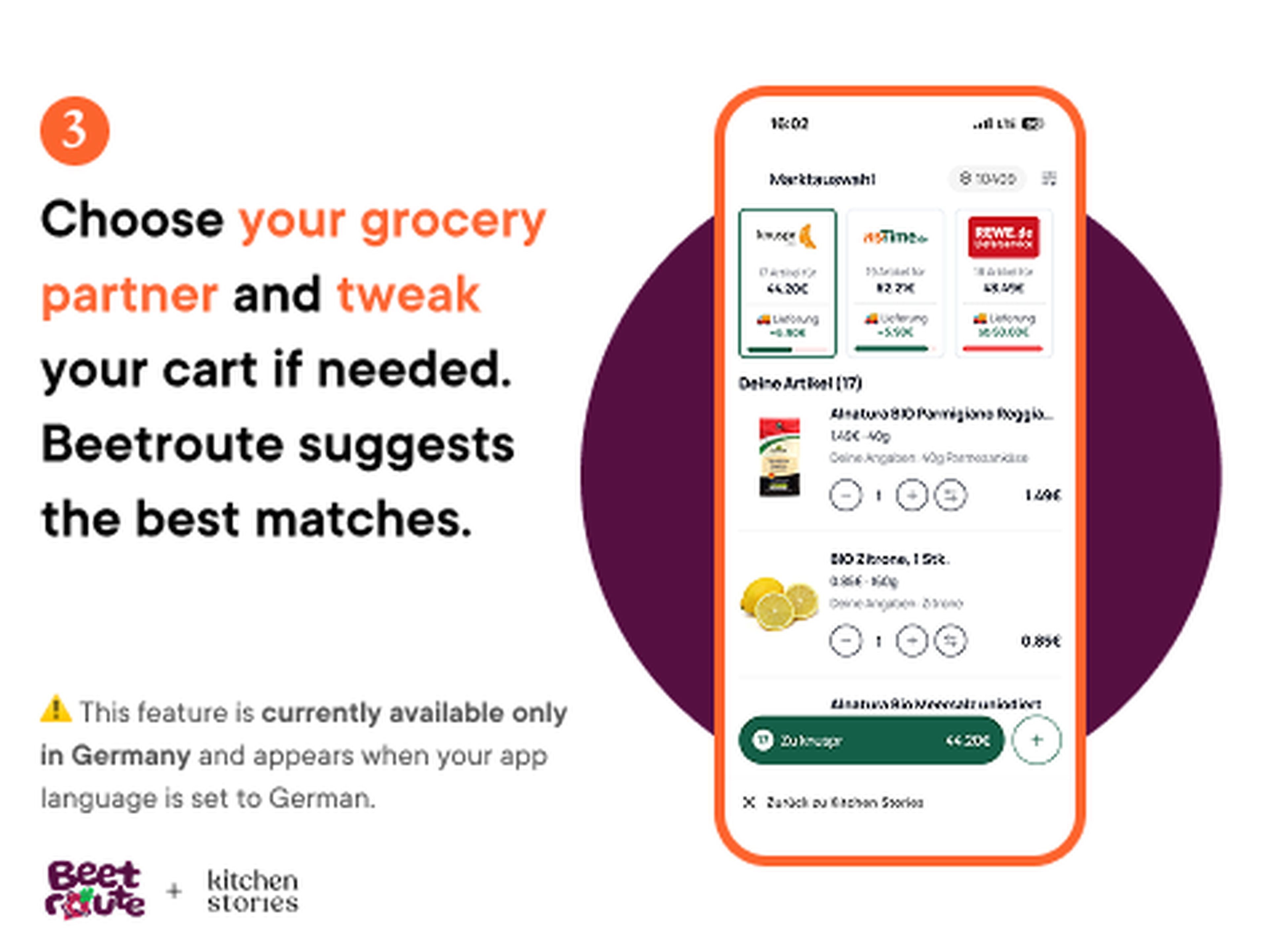 We’ve teamed up with our partner Beetroute to make it possible for you to buy ingredients directly from our app and get them delivered to your door with the partner of your choice. You can choose from several delivery services that you already know or want to discover. All this from your phone. Please note that we're rolling out gradually, so not everyone will see this just yet. Also, this service is only available in Germany and does include a limited number of partner stores for now.